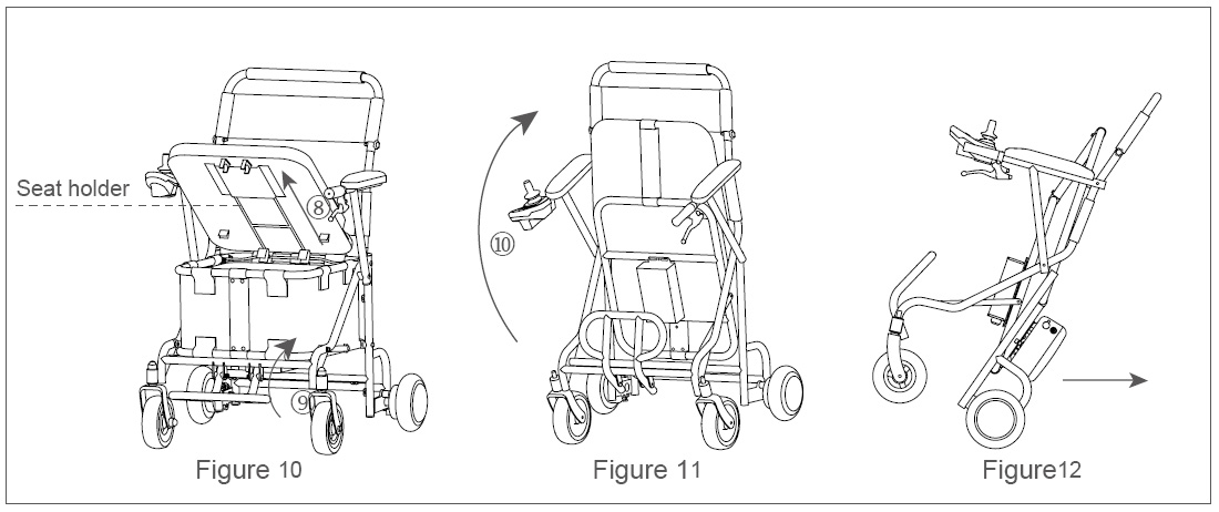 In shutdown mode, open the four fixing buttons of H8's cushion from outside to inside and remove the cushion from the seat holder( see Figure 10- ⑧ arrow). Lift the footrest( see Figure 10- ⑨ arrow), hold the upper frame and fold the body upward( see Figure 11- ⑩ arrow). After folding, riders can pull it to go.