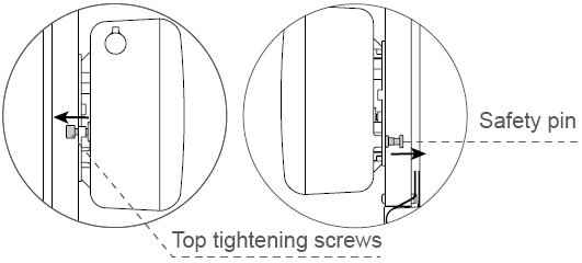 First loosen the toptightening screws, pull down the safety pin (as shown in the figure), remove the battery box to the negative direction of the safety pin, then take out the battery box to charge.