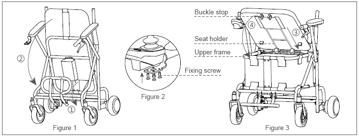 1. Take H8, cushion and other fittings from the package. First open the footrest (see Figure 1- ① ), then unfold the body (see Figure 1- ② ). Align the screw hole below joystick base with the mounting hole in front of the armrest and then tighten the fixing screw to fix it (see Figure 2).