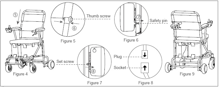 3. Put the backrest cross bar into the wheelchair body (see Figure 4- ⑤ ) and use thumb screw to fix (see Figure5- ⑥ ).